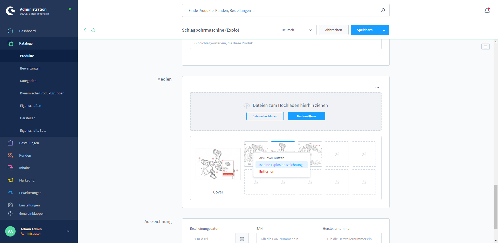 Navigate in the Shopware administration to "Catalogues" --> "Products" and open there the product to which you would like to add an exploded view.