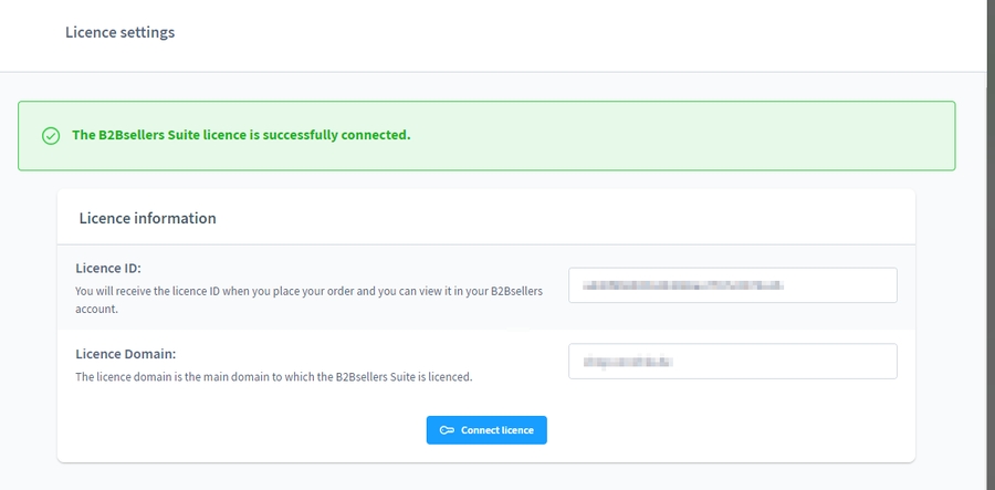 Enter your ID in the Licence ID field and enter your store domain. Now click on "Connect license" to successfully connect the store with your license.