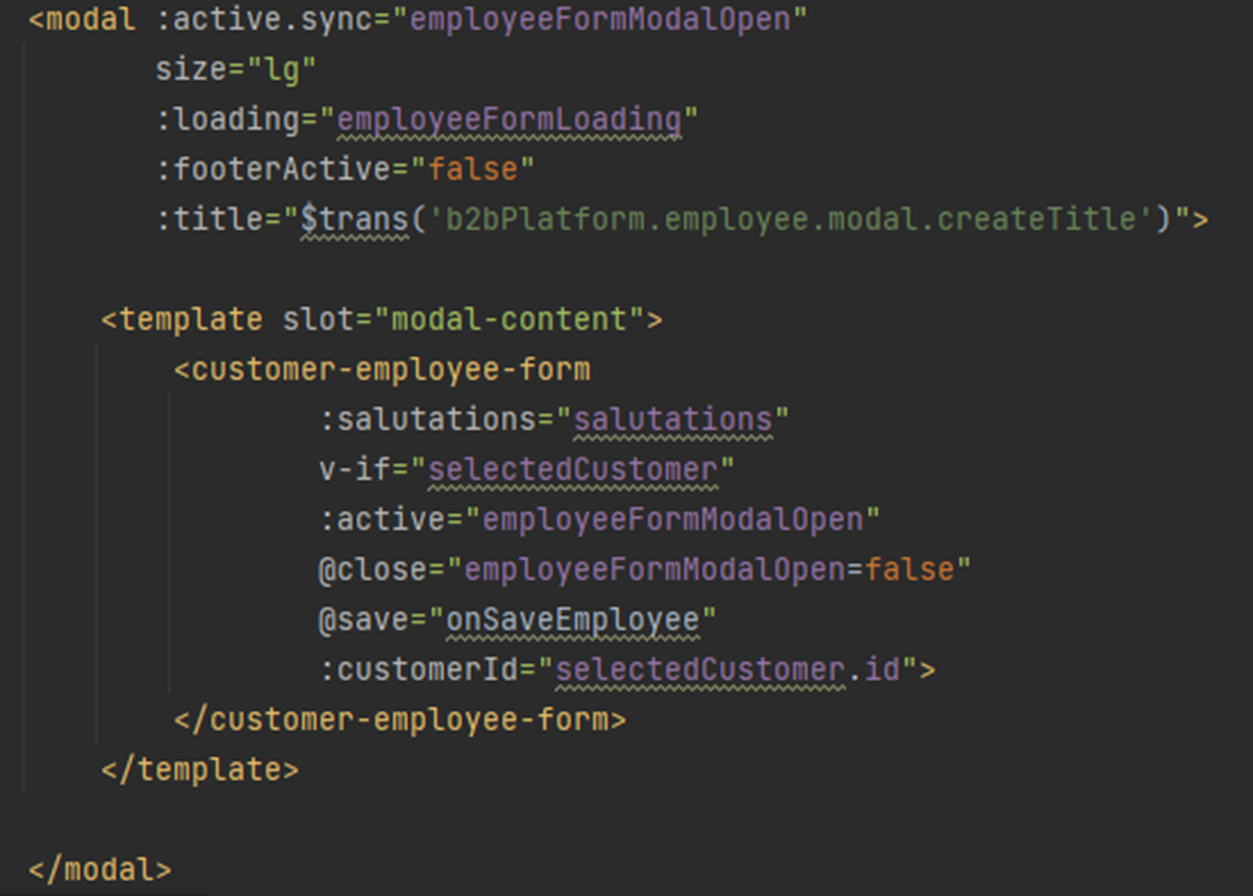 Since you surely have planned extensions to the B2B platform, we have provided you with some Vue.Js components that you can use at any time. From small helpers like the modal, the SW icons or a product search, we also provide a very complex data table, with manual column selection and any filtering options... But also a product detail modal or a "request for quote" modal. Feel free to use all components. Here is an example, you can of course also use translations in the B2BPlatform.