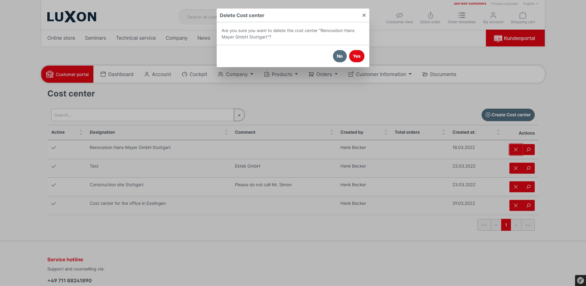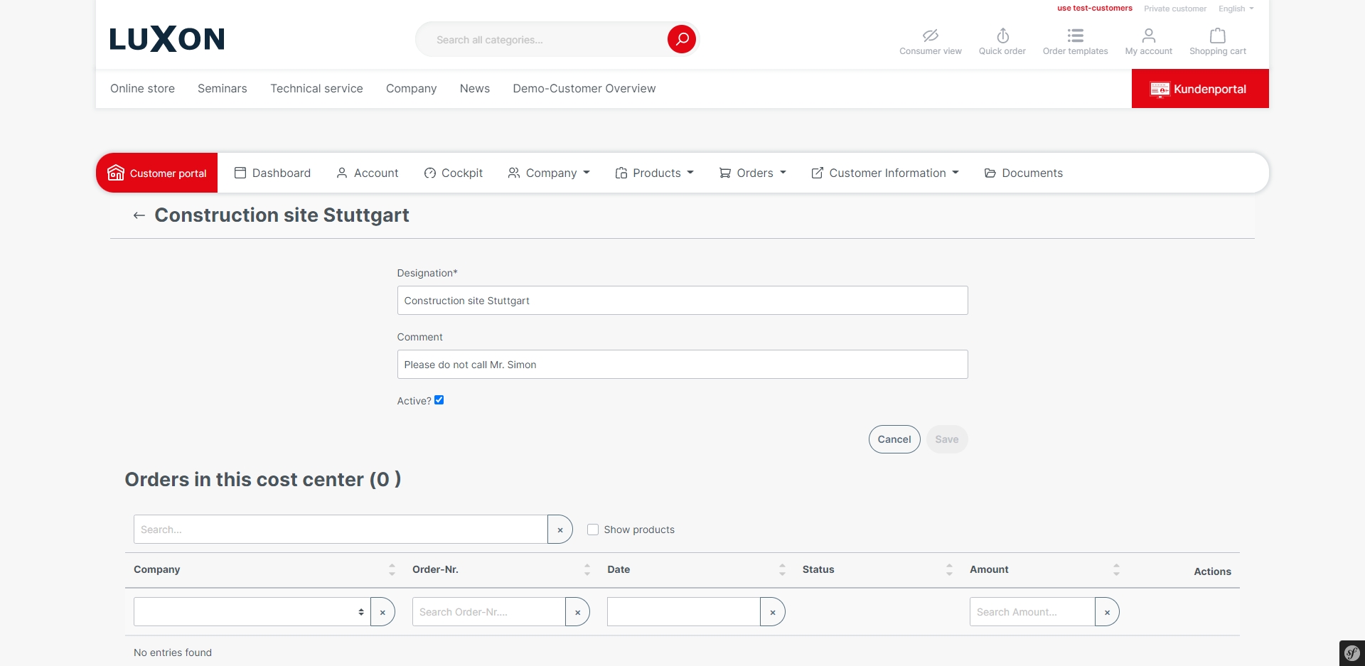 1. Navigate in the Dashboard of the B2B platform to "Company" > "Cost centers".