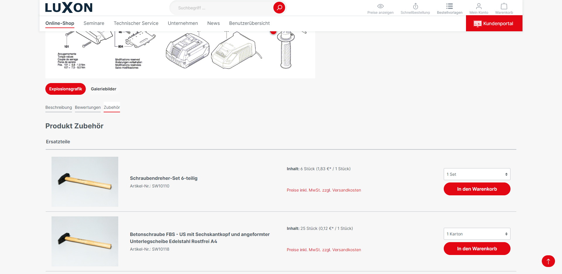 The linked products can be placed in the shopping cart directly from the exploded view.
