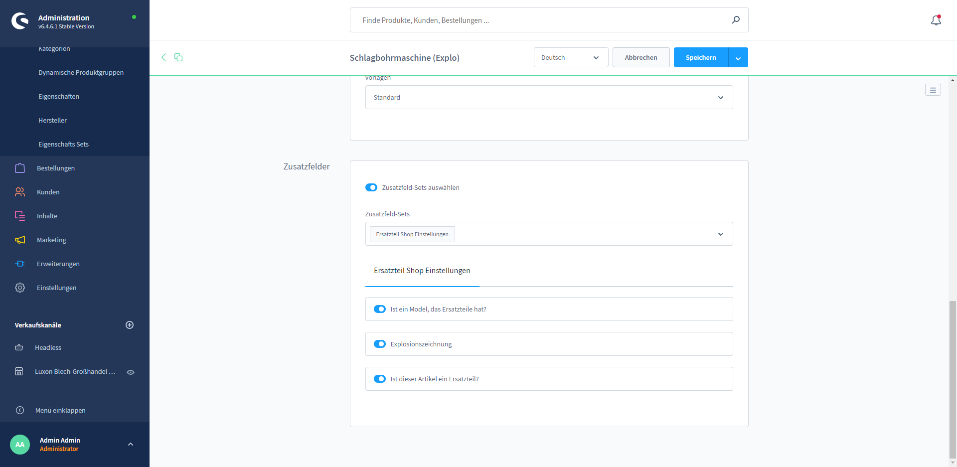 Navigate in the Shopware administration to "Catalogues" --> "Products" and open there the product to which you would like to add an exploded view.