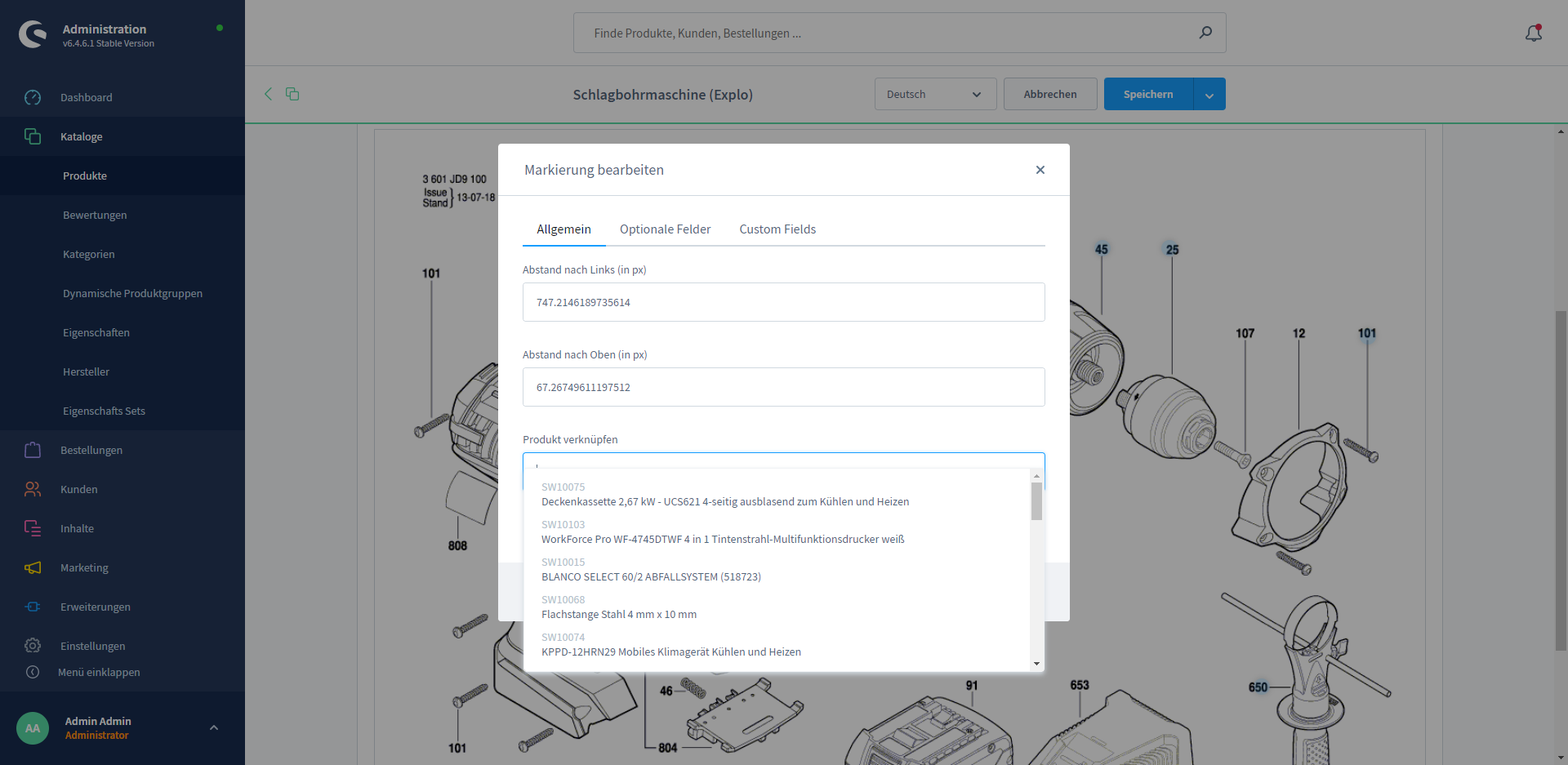 Navigate in the Shopware administration to "Catalogues" --> "Products" and open the product there, to which you want to add an exploded view.