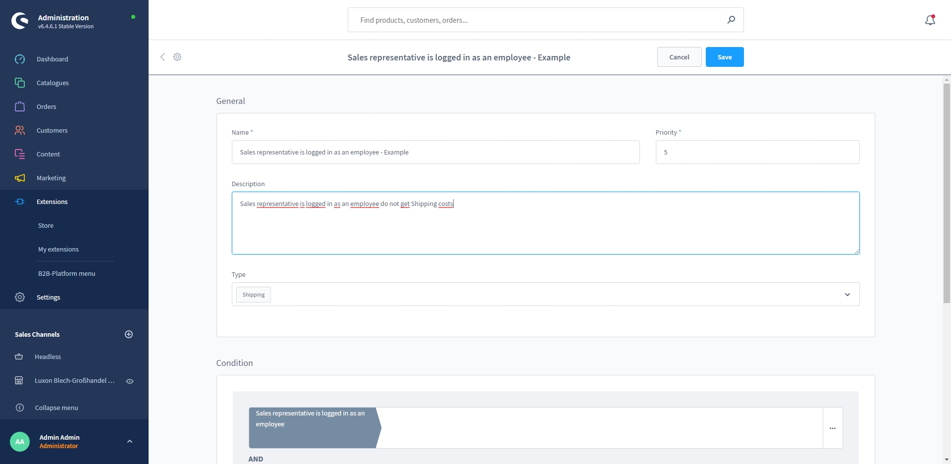 For example, a rule recognizes a sales employee if he or she is logged in as a customer in the shop. This rule could be used, for example, in the B2B platform navigation to display the menu item "Customer-specific prices" only as a logged-in sales employee. (If a sales employee is logged in.)