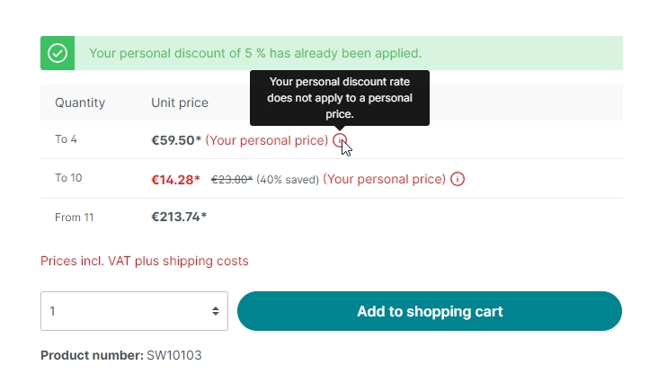 You should know that if a customer individual price is stored, this is drawn last and is therefore the last level of the price calculation. Even if you have stored a customer discount rate (addon), this is not taken into account and overwritten by the customer-specific price.