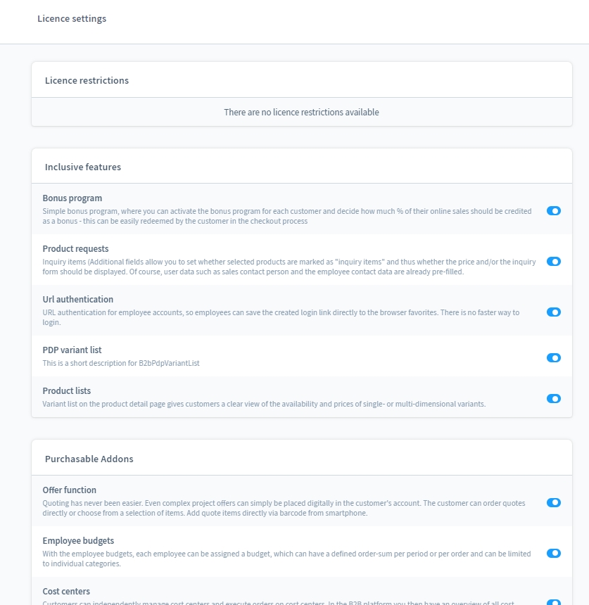 License, purchaseable Addons and Features configuration